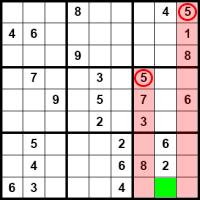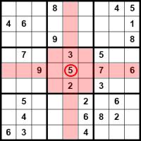 The example opposite shows which fields the 5 exactly in the middle blocks for further 5s. Under no circumstances can there be another 5 in the red area!